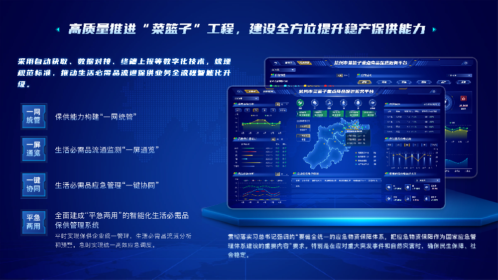 重塑“菜篮子”管理体系、机制和流程,提升“菜篮子”保供主体的现代化治理能力、科学决策能力、应急处 理水平,展现“菜篮子”全方位、全过程、全链条、全要素、全覆盖的智治图景。